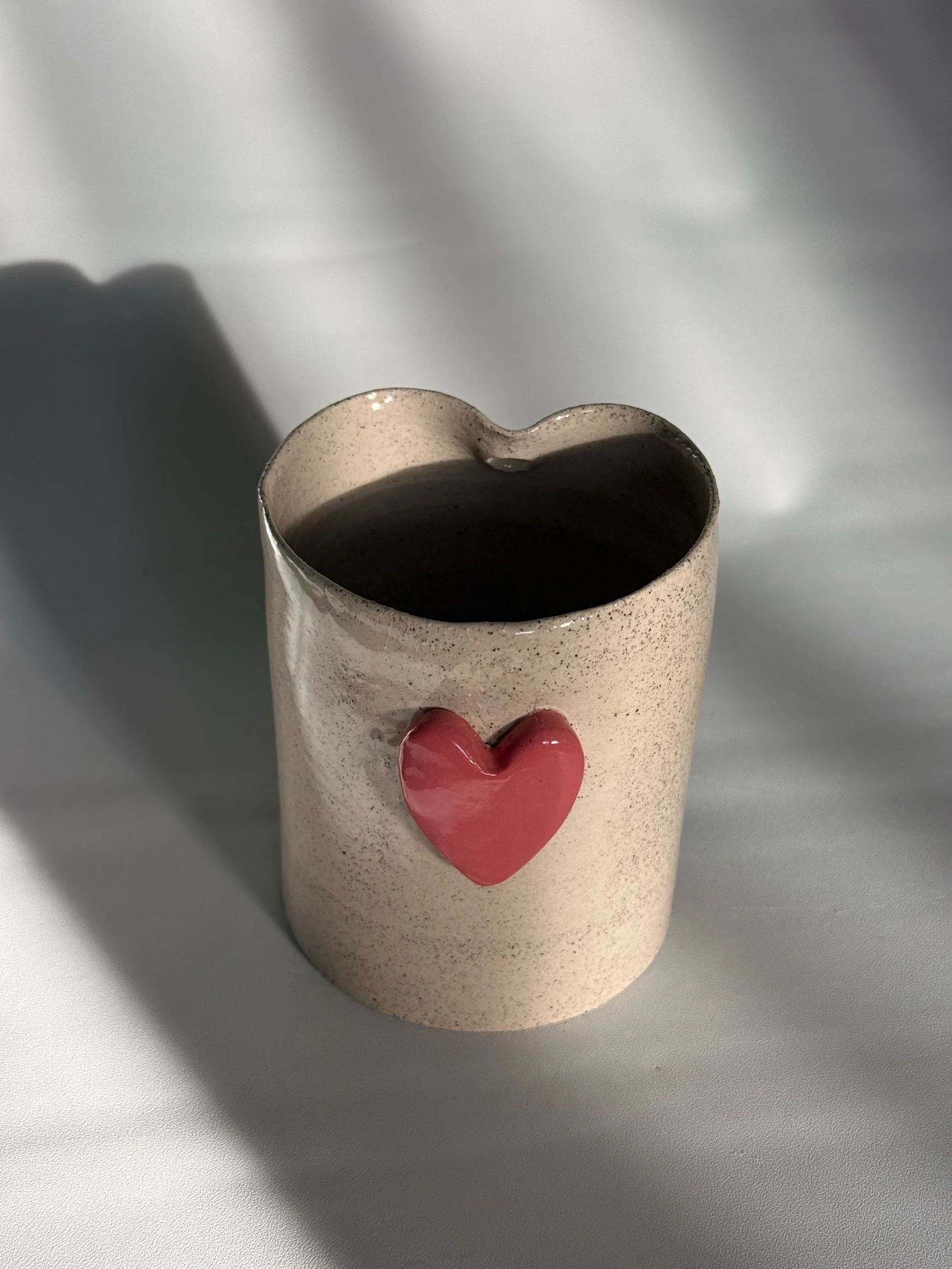 Store › Heart To Go Cup Image 1 of 4 Image 2 of 4 Image 3 of 4 Image 4 of 4 Heart To Go Cup $18.00 White speckled clay with red colored heart, coated in clear glazeHole to insert strawHolds 10-12oz Microwave safe Add To Cart Added! White speckled clay with red colored heart, coated in clear glazeHole to insert strawHolds 10-12oz Microwave safe